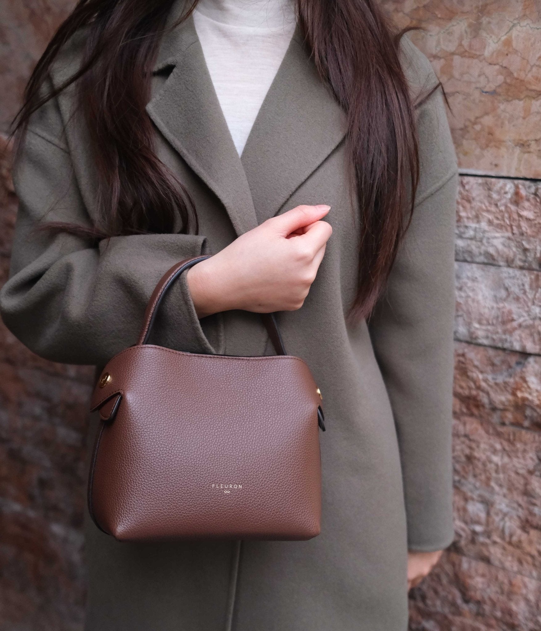 The Mini Swann in Tiramisu Grained Calfskin brings a warm, deep touch to any outfit. Its rich brown tone pairs effortlessly with neutral shades like ivory, beige, or light grey, and creates an elegant contrast with deeper hues such as camel, forest green, or midnight blue.