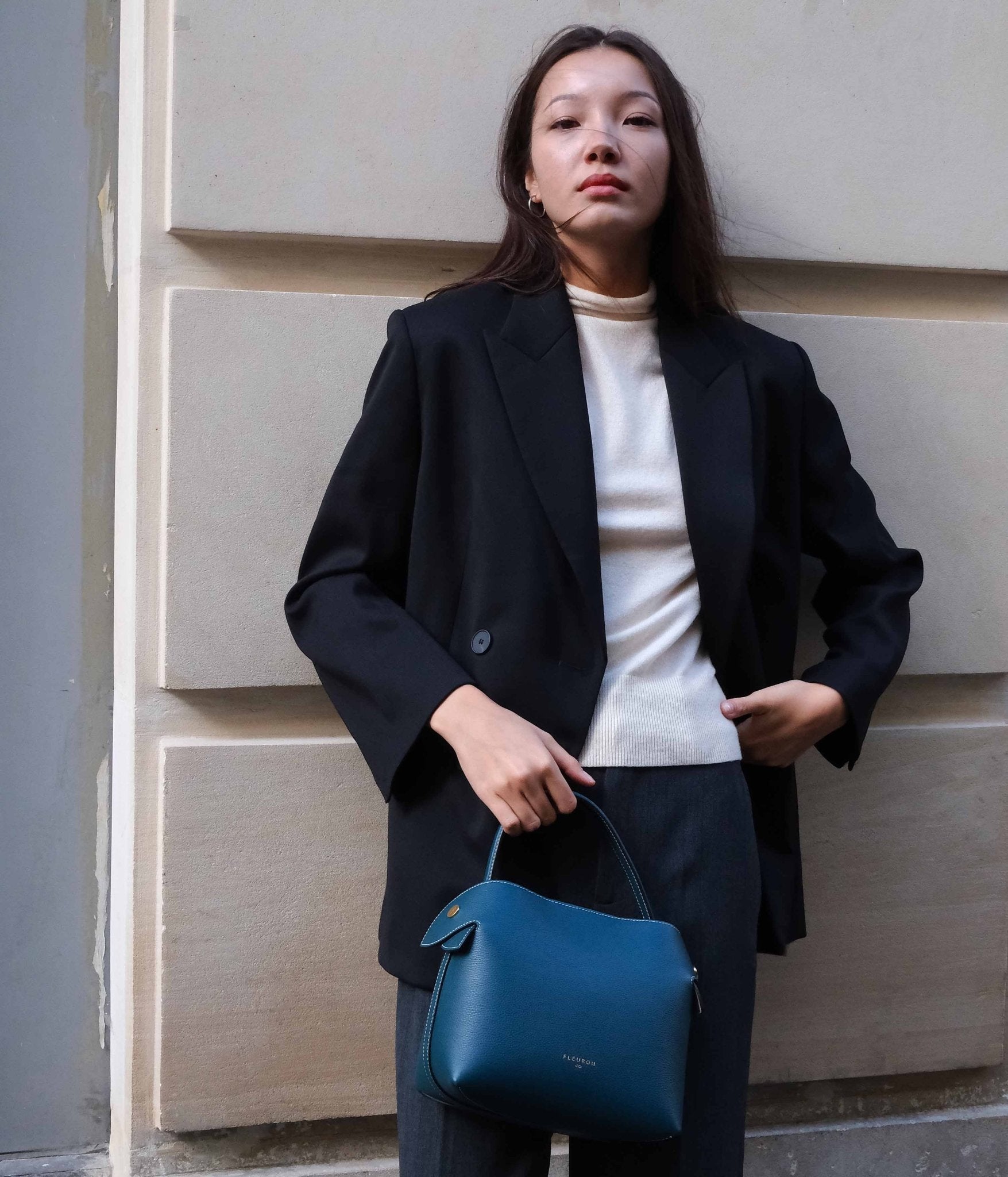 Pacific Blue embodies the serenity and tranquility of the marine depths. Designed to suit both a formal look and a casual outfit, this versatile handbag is as adaptable as you are. Handcrafted in our Italian workshop from grained calf leather, its robust design and golden finishes make it a reliable and elegant choice for any occasion.