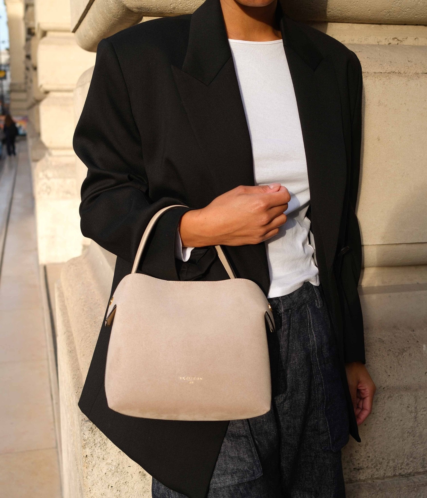 Carefully crafted, it stands out for the quality of its suede and discreet metallic details. With its adjustable and removable strap, it can be carried by hand, over the shoulder, or crossbody. A magnetic clasp keeps your essentials secure, while flexible side panels allow the silhouette to shift seamlessly from relaxed to sophisticated.