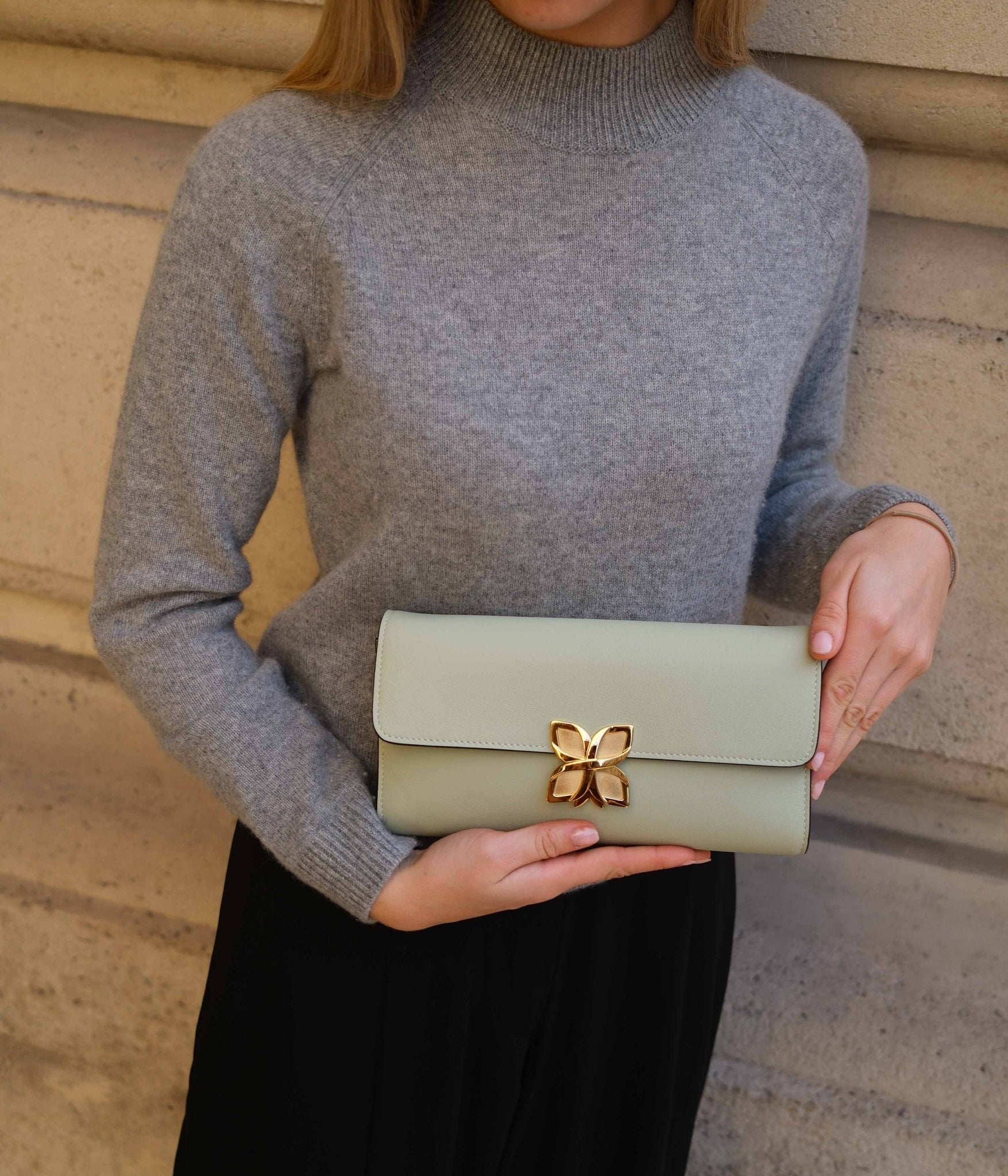 Carry it by hand for a refined look, or use its short, removable strap for a more relaxed style. The signature clasp, inspired by the hydrangea flower, adds a poetic touch to this sophisticated clutch, designed to accompany you seamlessly from day to night.