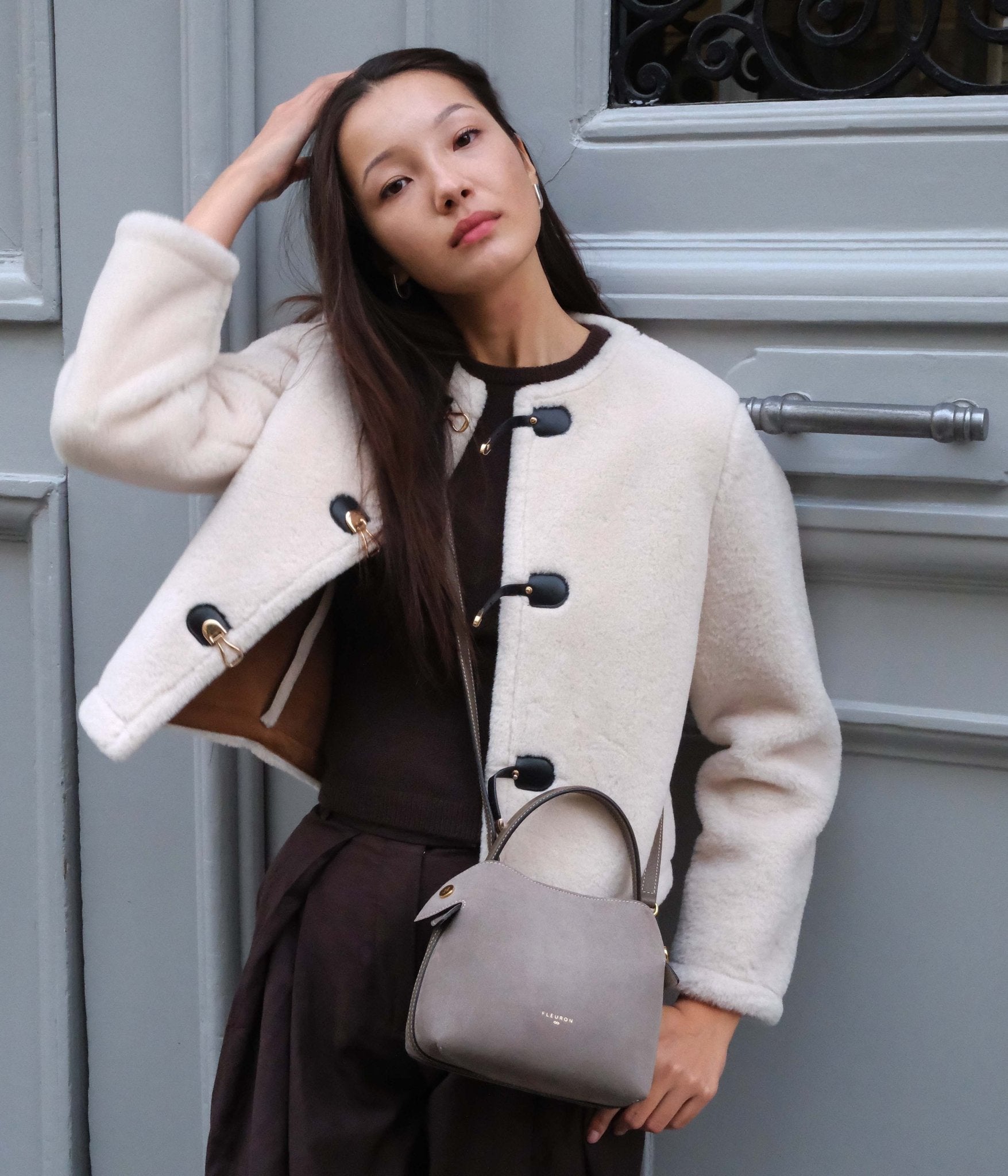 The Mini Swann in Calf Suede Taupe, designed in Paris and handcrafted in Italy, embodies understated and timeless elegance. Its compact size makes it the perfect companion to carry your essentials while adding a refined touch to any outfit.