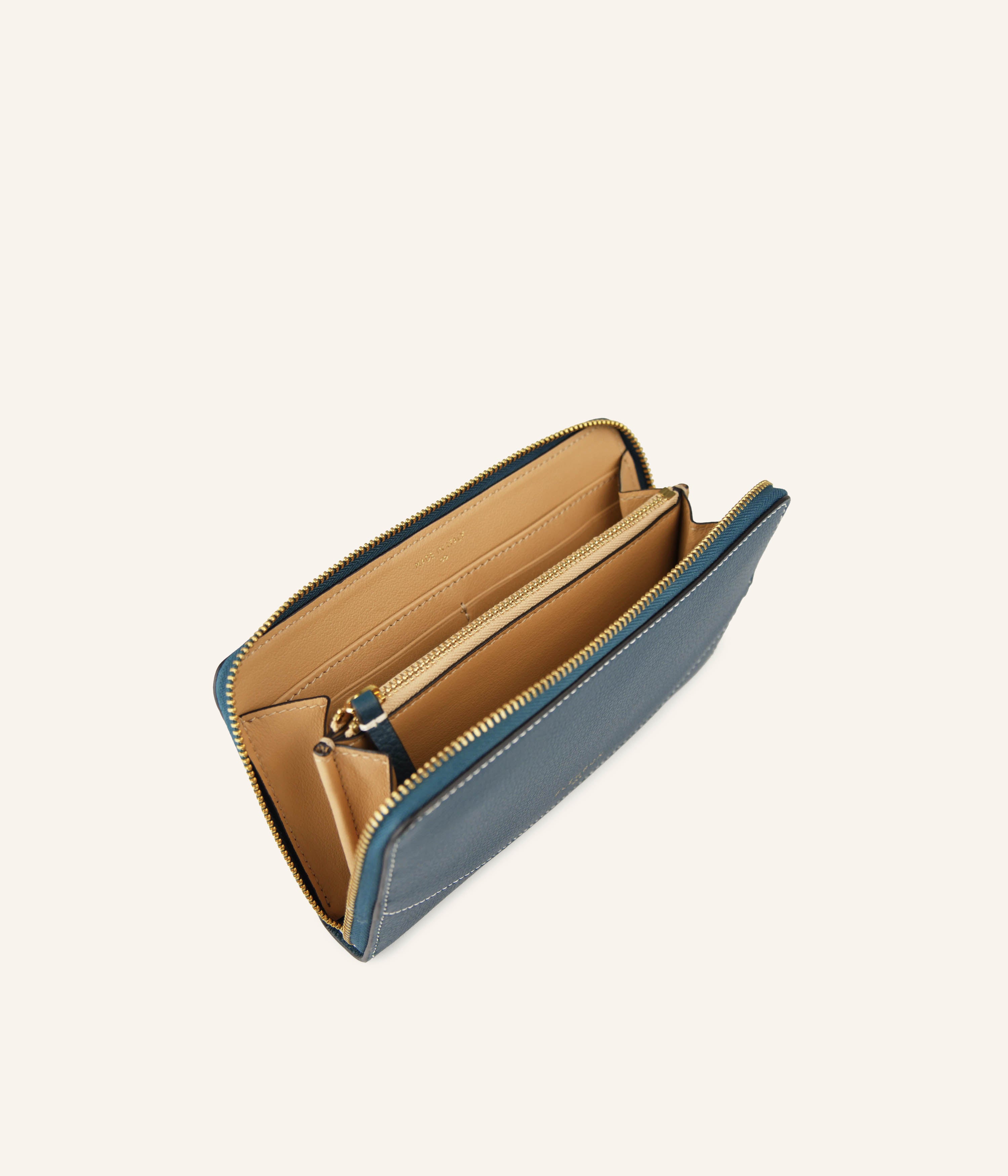 Let yourself be carried away by the freshness of Pacific Blue, a vibrant yet soothing shade that brightens your everyday essentials. Crafted from grained calf leather, this zipped wallet perfectly balances elegance and functionality. Its carefully organized interior provides ample space for your cards, bills, and coins. Made in Italy, it embodies the perfect harmony between refined design and artisanal craftsmanship.