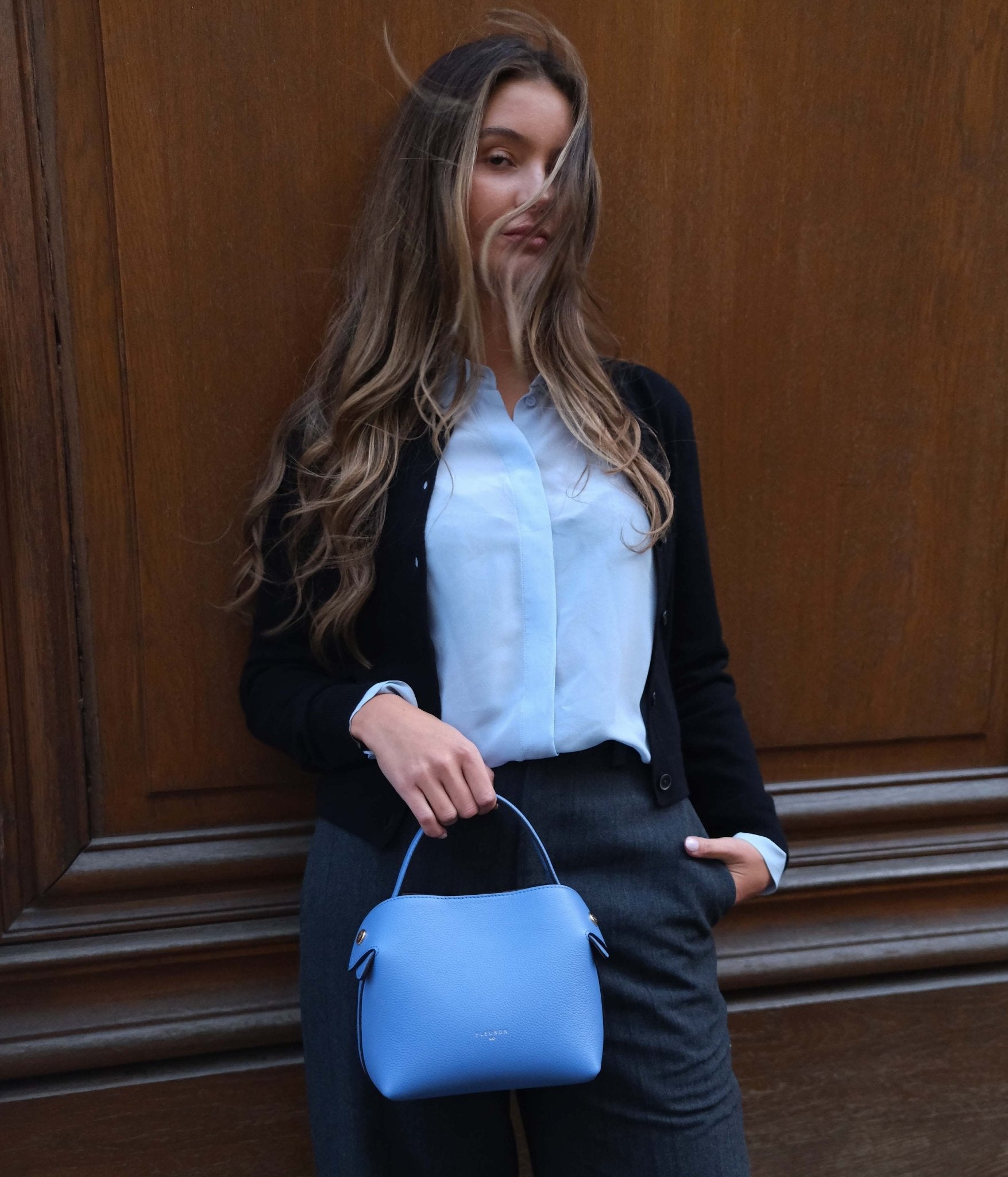 The Mini Swann in Grained Calfskin Jeans brings a modern, luminous touch to any outfit. Its soft yet deep blue tone pairs effortlessly with neutrals like ivory, beige, or light grey, and creates a contemporary contrast when styled with pale blues or brushed metal accents.