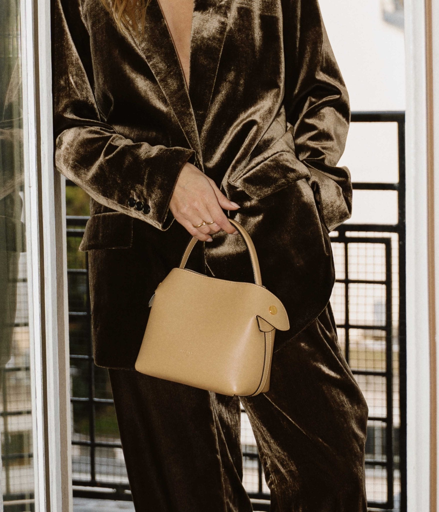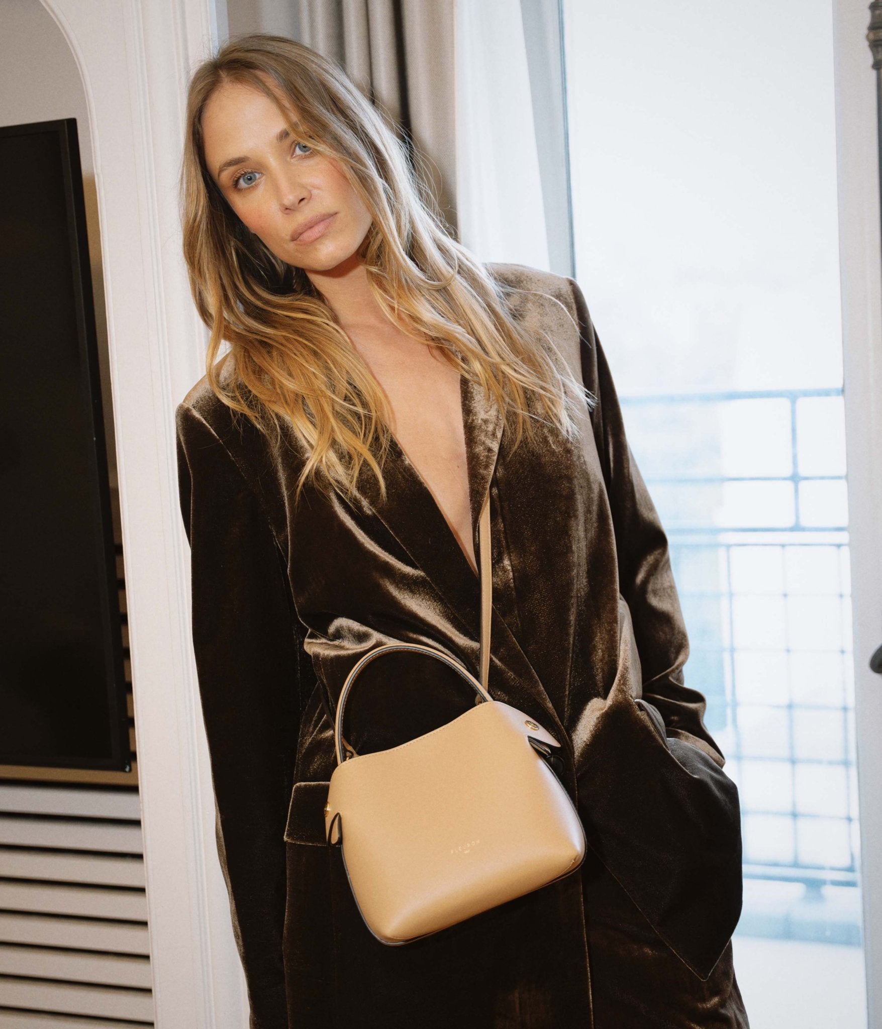 Handcrafted in our workshop in Italy, the Mini Swann in Cookie color stands out with its superior quality leather and delicate metallic finishes. It offers multiple carrying options: elegantly by hand, over the shoulder, or crossbody, thanks to its adjustable strap. A magnetic closure system secures the interior, lined with contrasting fabric. With its sides equipped with magnetic closures, this bag adapts to your style, whether for a chic, casual, or functional outfit.